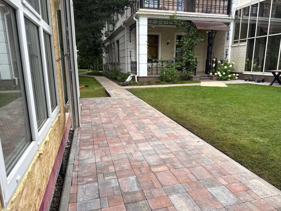 Вторым этапом уложили брусчатку, соблюдая технологию процесса. Результат на фото: